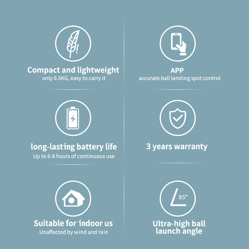 The launch angle can be manually set between 35 and 85 degrees, allowing for a variety of shots in spaces as small as 4 meters, making versatile training possible in almost any setting.